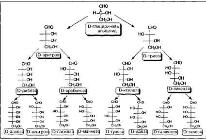 Диастереомеры различаются между собой различным взаимным расположением гидроксильных групп в пространстве, в результате чего они будут существенно различаться физическими и, в некоторой степени, химическими свойствами. В связи с этим, а также с учетом важности этих индивидуальных соединений в природной химии, каждому из диастереомеров присвоено свое собственное тривиальное название. Оптические же антиподы обозначают индексами D - и L - в зависимости от конфигурации последнего, по нумерации углеводородной цепи, асимметрического центра Так как при переходе от углеводной молекулы с п-асимметрическими центрами к молекуле с центрами количество конфигурационных изомеров удваивается, то, приняв за минимальную альдозу глицериновый альдегид и минимальную кетозу - эритрулозу, мы можем построить иерархическую схему стереохимического родства природных углеводов с учетом того факта, что, в основном, они относятся к D-ряду в проекциях Фишера.