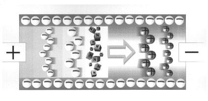 Свернём (мысленно) рассматриваемую поверхность в виде трубы с внутренним диаметром 50...100 мкм, тогда окажется, что практически вся жидкость, заполняющая её, будет представлять собой диффузную часть двойного электрического слоя. Трубу столь малого диаметра принято называть капилляром. Если в такой системе вдоль оси капилляра приложить электрическое поле, то в капилляре возникнет продольное движение свободных носителей электрических зарядов (разнополярных ионов) во взаимно противоположных направлениях, а поскольку в диффузной части двойного электрического слоя присутствует избыточная концентрация катионов, то число ионов, перемещающихся к катоду будет значительно больше, при этом их движение будет увлекать за собой всю остальную массу жидкости в капилляре (вследствие молекулярного сцепления и внутреннего трения). Возникает так называемый электроосмотический поток (ЭОП), направленный к катоду, который будет осуществлять пассивный перенос раствора внутри капилляра (рис. 3).
