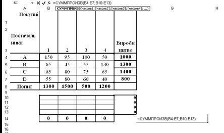 До комірки F10 внесено формулу =СУММ(B10:E10) і простягнуто її до комірки F13, до комірки В14 внесено формулу =СУММ(B10:B13) і простягнуто її до комірки Е14. До цільовій комірці G14 введено формулу (1) у вигляді виразу =СУММПРОИЗВ(B4:E7;B10:E13).