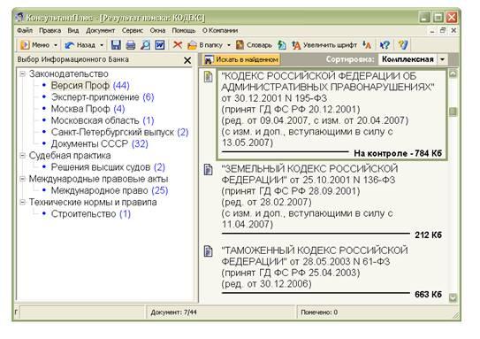 Справочно-Правовые Системы Консультант Плюс охватывают все федеральное законодательство и международное право, архивные правовые акты и законопроекты, содержат справочную и консультационную информацию по бухгалтерскому учету и налогообложению, комментарии законодательства, типовые формы документов, информационные банки, включающие судебные акты всех 10 федеральных арбитражных судов округов РФ, информационные банки по региональному законодательству, содержащие правовые акты 83 субъектов РФ. На сегодняшний день это крупнейший информационный массив, который может быть предоставлен пользователю. Всего в справочную систему Консультант Плюс входит более 4 000 000 документов.