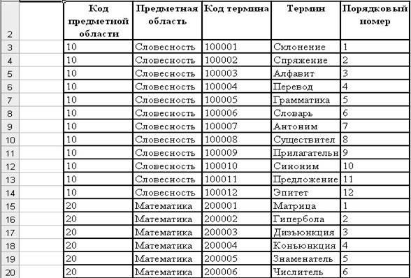 каждой из предметных областей присваивается код из двух десятичных цифр, первая из которых не должна быть нулем. После этого Код термина строится из шести десятичных цифр, первые две из которых представляют собой Код предметной области, а четыре оставшихся - порядковый номер данного термина в данной предметной области. Скопируйте таблицу Термины в соответствующий диапазон рабочего листа табличного процессора Excel с тем же названием. На рабочем листе Excel рекомендуется: