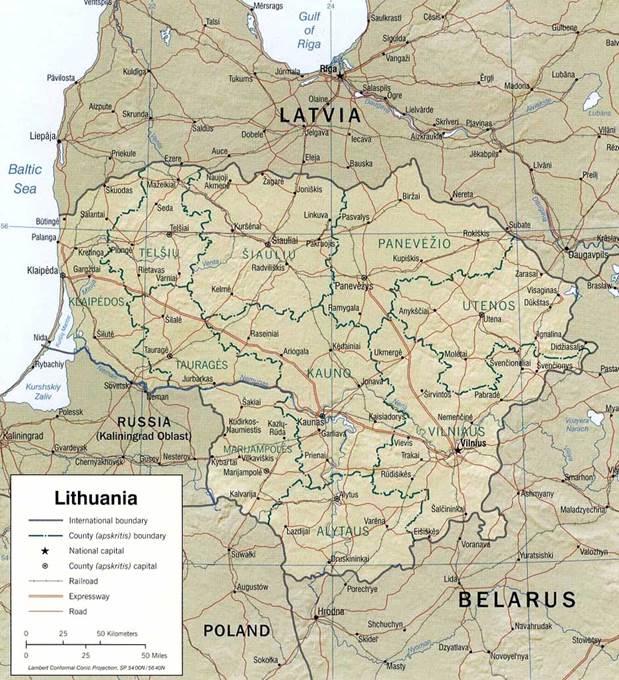 Географическое положение: Восточное побережье Балтийского моря. В 1989 г. Национальный географический институт Франции определил, что географический центр Европы находится в 24 км на северо-запад от Вильнюса. Площадь: 65,300 кв. км. Климат: морской/континентальный. Среднемесячная температура в июле +23°C, в январе -4,9°C. Временной пояс: по Гринвичу + 2 часа. Столица: Вильнюс. Число жителей: 3,454,000.