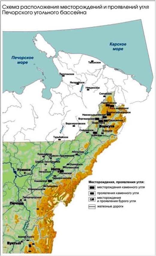 Рис.1. Схема расположения месторождений и проявлений угля Печорского угольного бассейна
