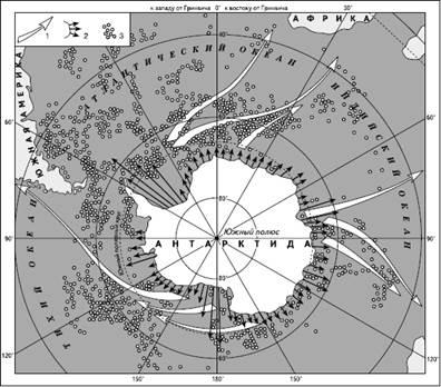 Рис. 3. Оптимальные маршруты транспортирования айсбергов в Антарктике (по В.М. Котлякову). Цифрами обозначены: 1 – маршруты транспортирования айсбергов; 2 – объемы айсбергов, ежегодно откалывающихся от каждых 200 км длины берега (длина стрелки в 1 мм соответствует 100 км3