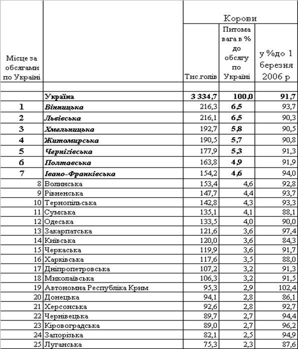 Рейтинг поголів’я ВРХ(корів) по регіонах станом на 1 березня 2007 року