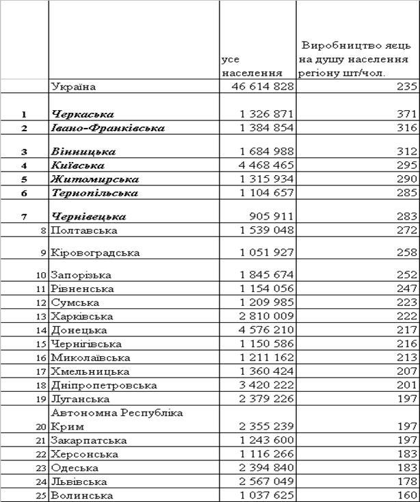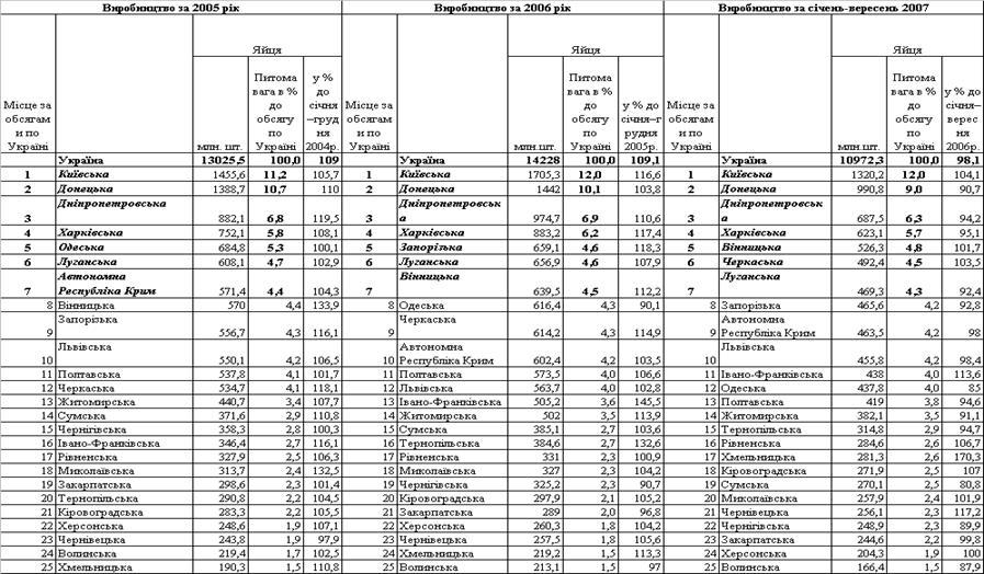 Рейтинг виробництва яєць по регіонах за 2005 –2007 роки
