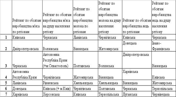 Підсумковий рейтинг виробництва продуктів тваринництва по регіонах за 2007 рік (перші “сімки” за обсягами та за обсягами на душу населення)