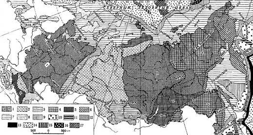 Обозначения на рисунке 5: I — древние платформы (а — щиты, б- плиты); II — Урало-Монгольский пояс (в — байкалиды, г — салаириды, д — каледониды, е — герциниды, ж — краевые прогибы, з — молодые плиты); III — Средиземноморский пояс (и — альпийские складчатые области, к — краевые прогибы, л — молодые плиты); IV — Тихоокеанский пояс (м — мезозойские складчатые области, н — срединные массивы, о — краевые прогибы, п — ларамийские складчатые области, р — окраинный вулканический пояс, с — кайнозойские складчатые области). Цифры на карте: I — древние платформы. Восточно-Европейская платформа — 1 — Балтийский щит, 2 — Русская плита; Сибирская платформа — 3 — Анабарский щит, 4 — Алданский щит, 5 — Таймырский щит, 6 — Среднесибирская плита. II — Урало-Монгольский пояс. Байкальские складчатые области — 7 — Байкало-Патомская, 8 — Саяно-Енисейская; Салаирские складчатые области — 9 — Баргузино-Витимская, 10 — Восточно-Саянская, Тувинская, Кузнецко-Алатауская; Каледонские складчатые области — 11 — Западно-Саянская и Горно-Алтайская; Герцинские складчатые области — 12 — Уральская, 13 — Томь-Колыванская и Салаирская, 14 — Монголо-Охотская; Герцинские краевые прогибы — 15 — Предуральский, 16 — Кузнецкий; молодые плиты — 17 — Западно-Сибирская, 18 — Тимано-Печорская, III — Средиземноморский пояс. Альпийские складчатые сооружения — 19 — Кавказ; краевые прогибы — 20 — Индоло-Кубанский, 21 — Терско-Каспийский; молодые плиты — 22 — Скифская. IV — Тихоокеанский пояс. Мезозойские складчатые области — 23 — Верхоянско-Чукотская складчатая система; срединные массивы — 24 — Колымский, 25 — Смоленский, 26 — Охотский, 27 — Чукотско-Юконский; мезозойский краевой прогиб — 28 — Предверхоянский; Ларамийские складчатые области — 29 — Сихотэ-Алинская складчатая система, 30 — Корякская; окраинный вулканический пояс — 31 — Охотско-Чукотский, 32 — Сихотэ-Алинский; кайнозойская складчатая область — 33 — Камчатско-Олюторская, 34 — Сахалин, 35 — Курильские острова, 36 — Командорские острова