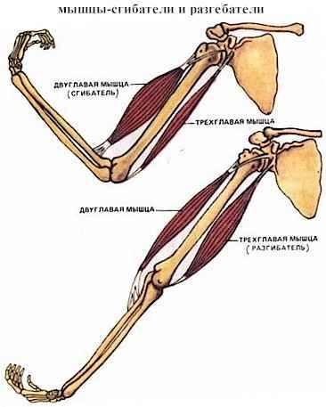 Сгибание в суставе осуществляется при сокращении мышц-сгибателей и одновременном расслаблении мышц-разгибателей.