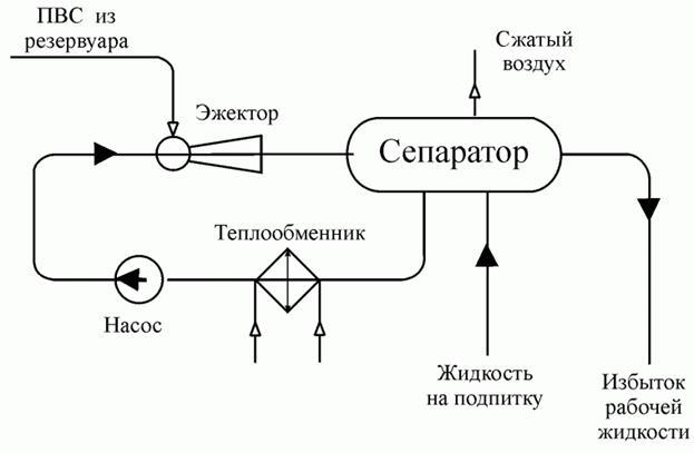 Принцип работы СКУ состоит в следующем. Рабочая жидкость подается в эжектор через сопло с помощью насоса и увлекает за собой пассивный поток паровоздушной смеси из резервуара. Часть энергии рабочей жидкости в процессе смешения фаз передается пассивному потоку, сжимая его. Одновременно происходит процесс интенсивной конденсации паров углеводородов. Образовавшаяся на выходе из эжектора жидкостно-газовая смесь разделяется в сепараторе, после чего осушенный сжатый воздух идет на дальнейшую очистку или в атмосферу, а рабочая жидкость подается на вход насоса. В системе предусмотрен теплообменник для отвода избытка теплоты, а также трубопроводы для подвода свежей рабочей жидкости на подпитку системы и отвода избытка рабочей жидкости со сконденсировавшимися парами углеводородов. Принципиальная схема установки представлена на рис. 2.