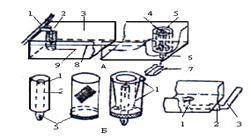 : 1 – водопадающая труба; 2 – рукав из мелкоячейного сита; 3 – лоток; 4 – водослив; 5 – фонарь из мелкоячейного сита; 6 – сбросная труба; 7 – сбросная канава; 8 – уровень воды в лотке; 9 – направление воды в лотке;