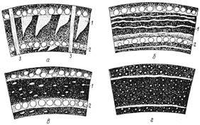 Кора покрывает снаружи камбий и древесину. На поперечном разрезе ствола она имеет форму кольца, окрашенного обычно значительно темнее древесины (рисунок 1.2). В толстой коре взрослых деревьев различают два слоя с постепенным или резким переходом от одного к другому: наружный – корку (его назначение предохранять живые ткани ствола от резких колебаний температуры, испарения влаги, проникновения грибов, бактерий и механических повреждений) и внутренний слой – луб, непосредственно прилегающий к камбию. Назначение луба – проводить вниз по стволу образующиеся в листьях органические питательные вещества. У молодых деревьев кора гладкая, иногда покрытая тонкими опадающими чешуями; при утолщении ствола в коре появляются трещины, которые с возрастом дерева углубляются. По характеру поверхности кора может быть гладкой (пихта), бороздчатой (дуб), чешуйчатой (сосна), волокнистой (можжевельник) и бородавчатой (бересклет). Цвет коры снаружи изменяется в широких пределах: от белого (береза), светло-серого (пихта), зеленовато-серого (осина) до серого (ясень), темно-серого (дуб), или темно-бурого (ель). С каждым годом толщина коры увеличивается. Однако вследствие малой величины годичного прироста и постепенного отпада наружных слоев в виде чешуй кора никогда не достигает такой толщины, как древесина. Относительный объем коры в стволе (без сучьев) для основных пород приведен в таблице 1.1 [1].
