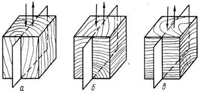 Ствол изучают на трех главных разрезах: поперечном, и двух продольных – радиальном и тангенциальном (рисунок 1.2). Плоскость поперечного, или торцевого, разреза перпендикулярна оси ствола. Плоскость одного из продольных разрезов проходит через сердцевину ствола по радиусу торца – радиальный разрез, плоскость другого разреза – тангенциального – направлена по касательной к окружностям, образованным слоями годичного прироста. На поперечном разрезе можно указать радиальные и тангенциальные направления, а на продольных разрезах направления вдоль волокон и радиальное или тангенциальное.