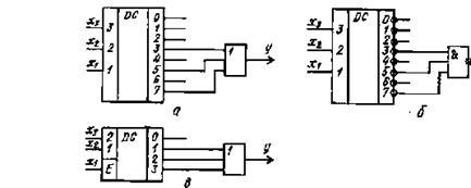 Наприклад, функцію , представлену в ДДНФ, можна реалізувати за допомогою трьох входового дешифратора з прямими (рис. 1.2, а) чи інверсними (рис. 1.2, б) виходами.