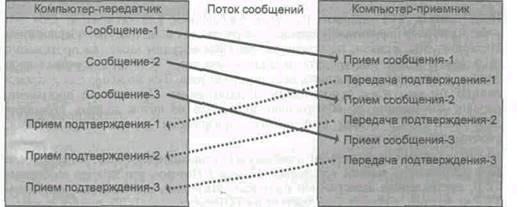 Рис. .5. Передача сообщений и подтверждений о доставке по схеме скользящего окна
