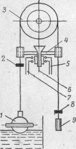 предназначено для воздействия на электрическую цепь при определенном уровне воды в резервуаре. В резервуар, в котором контролируется уровень жидкости, погружается поплавок 1 (рис. 1.3.1), подвешенный на конце троса, перекинутого через блок 3. На другом конце его укреплен уравновешивающий груз 9. На обеих ветвях троса укреплены две переключающие шайбы 2 и 8, которые при предельных уровнях жидкости в резервуаре поворачивают коромысло 4 контактного устройства 6 и замыкают контакты проводов 7 и 5. Эти контакты в свою очередь замыкают или размыкают соответствующие исполнительные цепи управления. Во избежание неустойчивой работы агрегата необходимо обеспечить мгновенное перемещение контактов из одного положения в другое.