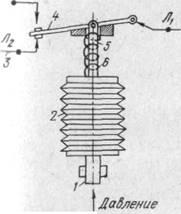 (рис. 1.3.2) состоит из гофрированной тонкостенной трубки 2, закрытой с двух концов. В дне этой трубки сделано отверстие, где закреплен штуцер 1 для включения реле в трубопровод. На стержне 5 прикреплен рычаг 4, соединенный с контактами 3. При повышении давления трубка 2 сильфона растягивается, приподнимает рычаг 4, и цепь сети управления разрывается. При снижении давления пружина 6 сжимает трубку 2 и переводит рычаг 4, вследствие чего цепь сети управления через линейные провода Л1
