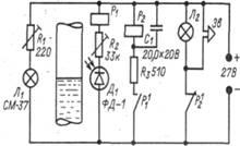 На рис. 1.3.10 приведена схема простого регулятора уровня, в котором используются фотодиод Д1 или фоторезистор (ФСА-1) и миниатюрная лампа накаливания Л1.
