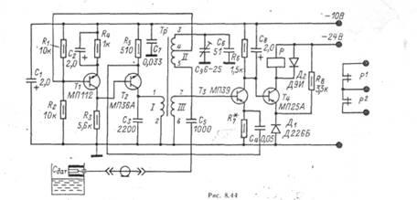 (рис. 1.3.8). Датчики реле питаются переменным током. В реле применен несимметричный триггер с эмиттерной связью на транзисторах Т1 и Т2