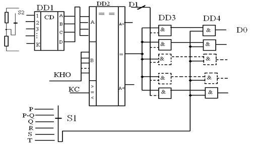 На схеме DD1 выполнен шифратор номера кода отведения, подаваемая на схему сравнения кодов DD2. На другие входы этой схемы поступает непрерывно изменяющийся код номера отведений КНО. При совпадении этих кодов на входе DD2 появляются импульсы, отпирающие клапаны DD3, на которые подается параллельный входной код DI (date input) с входа АЦП. Для выбора необходимого элемента ЭКГ применена вторая группа логических схем DD4. на нее подаются импульсы необходимого элемента через переключатель S1.
