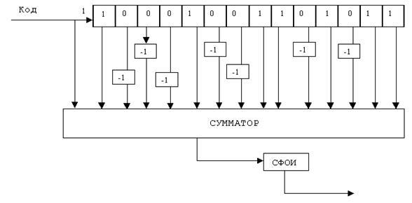 По полученным ранее данным построим структурную схему согласованного фильтра для синхронизирующей М-последовательности.