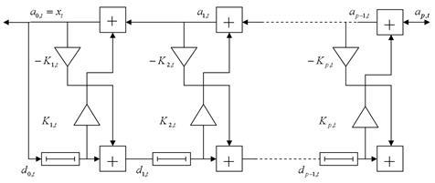 Поиски эффективных алгоритмов вычисления коэффициентов АР привели к синтезу решетчатых структур. Решетчатые структуры могут быть реализованы в виде решетчатых фильтров (РФ). Параметрами РФ являются коэффициенты отражения и число звеньев фильтра. Коэффициенты отражения однозначно связаны нелинейными соотношениями с параметрами АР и определяются, в конечном счете, корреляционной функцией случайного процесса. Число звеньев РФ равно порядку АР модели. РФ, также как и АР фильтры, являются фильтрами предсказания, минимизирующими дисперсию ошибки предсказания.