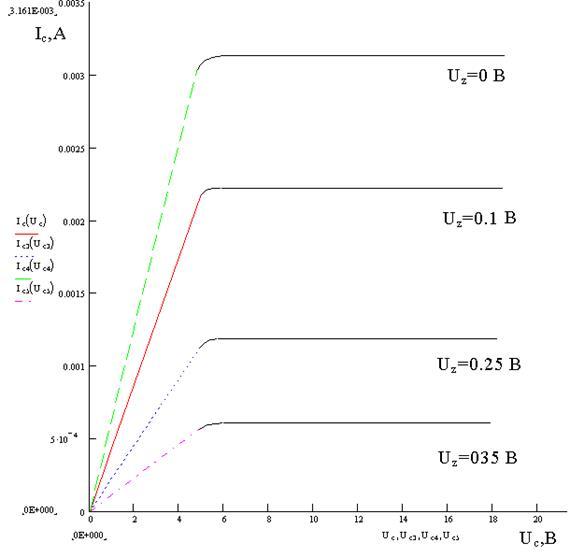 2) При фіксованій напрузі зміщення на затворі струм в каналі збільшується зі зростанням напруги на стоці доки при деякій порівняно невеликій напрузі Uc