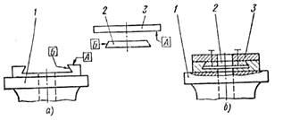 2. Устанавливают деталь 2 в деталь 1, при этом деталь 2 прижимают с помощью планки 3 к трущимся плоскостям Б детали 1 с обеих сторон и щупом проверяют зазор между деталями 2 и 3 или 1 и 3 (рис. 4, б).