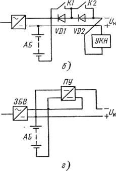 В схеме на рисунок 1,б предусматривается регулирование напряжения на нагрузке посредством закорачивания групп вентилей VD1 и VD2 с помощью контакторов К1 и К2, управляемых устройством контроля напряжения. В условиях нормального электроснабжения контакты контакторов К,1 и К2 разомкнуты. При разряде аккумуляторной батареи, по мере снижения напряжения контакторы К1 и К2 осуществляют поэтапное закорачивание групп вентилей. ЭПУ достаточно проста, но характеризуется низким КПД и может быть рекомендована при сравнительно небольших мощностях. ВСН 332—88 рекомендуют применять эту схему в ЭПУ ±«60 В» при нагрузках до 70 А и в ЭПУ —«24 В» —до 100 А.