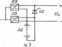 В системе электропитания с отделенной от нагрузки резервной аккумуляторной батареей (рисунок 2, а) при нормальном электроснабжении питание аппаратуры связи осуществляется от стабилизирующего выпрямителя БВ, а АБ находится в режиме непрерывного подзаряда от дополнительного зарядного выпрямителя 3В и отключена от нагрузки тиристором VS. При пропадании сети переменного тока или аварии в БВ тиристор VSподключает АБ к нагрузке без перерыва в питании аппаратуры. Послеаварийный заряд АБ осуществляется при ее отключении от нагрузки, что дает возможность исключить из состава ЭПУ устройства регулирования напряжения, т. е. существенно упростить ЭПУ. Эта система применяется для питания аппаратуры, допускающей достаточно широкие пределы изменения питающего напряжения, например для АТС первого и второго поколений небольшой емкости (при выходной мощности ЭПУ до 2 кВт).