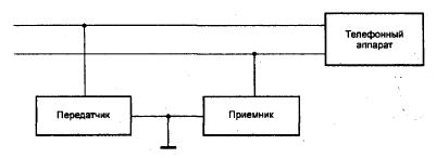При положенной на рычаг телефонной трубке с линией соединен электрический звонок, который бывает электромагнитным либо капсюльным (пьезоэлектрическим или электродинамическим). Первый из них подключен к линии фактически напрямую, тогда как второй - через радиосхему. Непосредственное (через конденсатор) подключение электромагнитного звонка позволяет реализовать его обратимость, или "микрофонный эффект", т.е. возникновение в нем электрического тока при различных механических (в том числе и от звуков голоса) вибрациях подвижных частей конструкции. Амплитуда возникающего сигнала достигает нескольких милливольт, которых хватает для его дальнейшей обработки, проводимой, впрочем, не слишком далеко от используемого аппарата. Дальность этой системы, не превышает (из за затухания) нескольких десятков метров. Прием осуществляется на качественный, малошумящий усилитель низкой частоты.