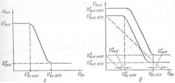 На рисунке 2а показана передаточная характеристика инвертирующих ИЛЭ (например И-НЕ, ИЛИ-НЕ) в предположении, что их характеристики идентичны. Действительно наблюдается разброс указанных характеристик как за счёт разброса параметров компонентов, входящих в состав ИЛЭ, так и за счёт различия режимов отдельных элементов. Поэтому передаточная характеристика для некоторой совокупности однотипных элементов представляет собой не одну кривую, а некоторую область, ограниченную сверху и снизу двумя граничными кривыми (рисунок2б).