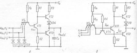 Рисунок 7. а- сочетание диодного логического элемента И с транзисторным инвертором. На этом же рисунке различные модификации