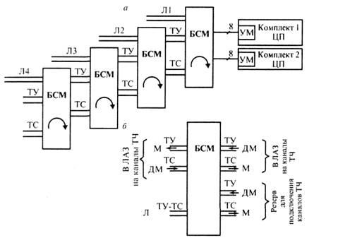 Сигнал ТС из четырехпроводной линии суммируется с сигналом ТС из двухпроводной линии и поступает на входы модемов. Для разделения сигналов ТУ и ТС в двухпроводной линии используется фильтр высокой частоты. Схема БСМ обеспечивает возможность приема сигналов ТС одновременно из двух- и четырехпроводных линий, а также использования БСМ для передачи сигналов в ретрансляционных пунктах (рис.5). На этом рисунке ЛАЗ — линейно-аппаратный зал, М — модулятор, ДМ — демодулятор.