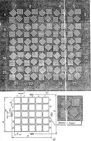 Мира представляет собой испытательную таблицу (рис.3,а), в которой расстояние между штрихами меняется по определенному закону. Мира состоит из 25 групп, каждая из них состоит из четырех квадратов (рис.3,б), в которых нанесены штрихи в четырех направлениях. В каждой мире ширина штрихов при переводе от группы №1 к группе №25 убывает на 6%.