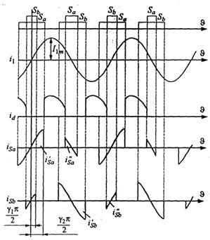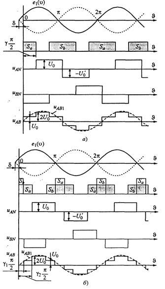 отражены эпюры, характеризующие два возможных алгоритма управления двунаправленными ключами выпрямителя. Условимся называть их алгоритм I и алгоритм II. При этом Sa