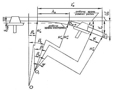 - кут між робочою гранню рамної рейки і дотичною, проведеною до робочої грані гостряка в кінні його бокового стругання, - кут стругання криволінійного гостряка (Рис. 1).