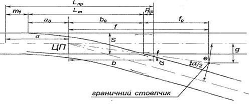 за напрямком зовнішньої рейкової нитки прямої колії (рис. 8.2). Ці відрізки визначають, користуючись відомими значеннями лінійних розмірів переводу, гостряків і довжин рейкових рубок.