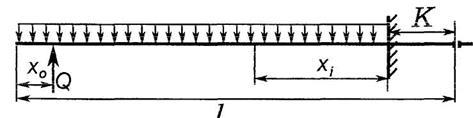 Розрахункова схема роботи гостряків при їх переводі залежить від конструкції гостряка, його довжини і типу кореневого кріплення. Для гнучкого гостряка зі звичайним накладочним кореневим кріпленням розрахункова схема являє собою балку, затиснену в корені і завантажену силами в місцях приєднання перевідних тяг і рівномірно розподіленим навантаженням, що дорівнює силам тертя гостряка по подушках. На рис.3 приведена розрахункова схема гнучкого гостряка з однією перевідною тягою. Припустивши, що перетин гостряка на всій довжині незмінний і при переводі гостряків один з них згинається, а інший розгинається, одержимо вираз для визначення зусилля, необхідного для переводу пари гостряків: