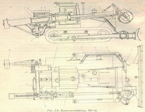 Каналоочиститель МР-16 может осуществлять очистку каналов глубиной до 3 м и выполнять разравнивание кавальеров и другие бульдозерные работы. Он представляет самоходную машину на базе болотоходного трактора тягового класса 6 с навесным оборудованием для очистки каналов, оснащенную дополнительным бульдозерным оборудованием.