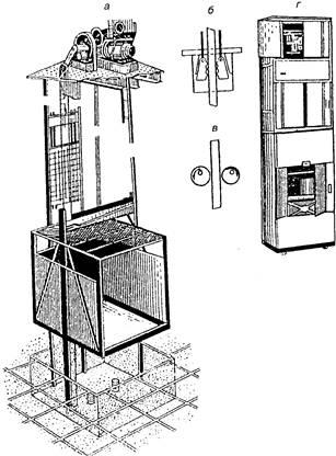 а - схематическое устройство; б - клинковые ловители; в - эксцентриковые ловители; г - лифт магазинный шкафной ЛМШ-150