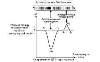 Держатель пробы нагревается с помощью регулируемой электрической печи. При такой схеме, если температуру держателя равномерно увеличивать, температура, как пробы, так и инертного вещества равномерно повышается до тех пор, пока в исследуемом веществе не начнется химическая реакция или другое превращение с тепловым эффектом. С этого момента, в зависимости от того, является ли реакция экзотермической или эндотермической, начинается, соответственно, повышение или снижение температуры пробы. Таким образом, разность потенциалов между полюсами первой термопары останется неизменной или же начнет повышаться быстрыми темпами. Поскольку эта разность компенсироваться равномерно увеличивающимся напряжением второй термопары не будет, гальванометр даст показания, по знаку и величине соответствующие разности температур.