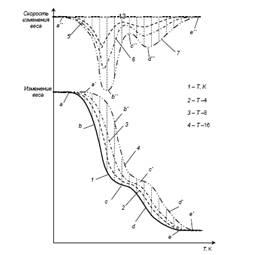 Графически изображенные результаты измерения дают термогравиметрическую кривую (рис. 4). Если изменение массы регистрируется автоматически, кривая ТГ строится в зависимости не от температуры, а от времени, однако такая замена оси абсцисс обратима, если одновременно фиксируется и зависимость температуры в печи от времени. Наиболее просто замена оси абсцисс осуществляется в том случае, когда повышение температуры в печи происходит равномерно во времени.