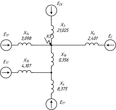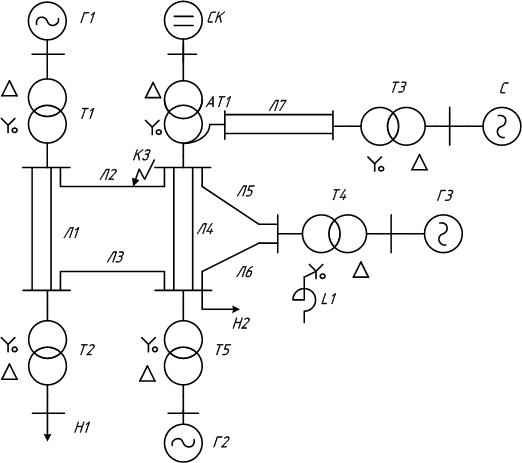 1. При симметричном трёхфазном коротком замыкании в заданной точке «К» схемы определить аналитическим путём, а также методом расчетных кривых, начальное значение периодической составляющей тока и ударный ток.