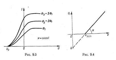 Сила фотоструму зростає зі збільшенням різниці потенціалів і при деякому значенні напруги U досягає насичення (рис. 9.2). Узагальнюючи результати експериментальних даних, встановлено такі закономірності фотоефекту: при сталому спектральному складі світла сила фотоструму / насичення прямо пропорційна світловому потоку Ф, що падає на катод (рис. 9.3); початкова кінетична енергія вивільнених світлом електронів залежить лінійно від частоти світла і не залежить від його інтенсивності (рис. 9.4); фотоефект не виникає, якщо частота світла менша від деякої характерної для даного металу величини vmin; фотоефект — явище безінерційне, тобто з припиненням освітлення поверхні він припиняється.
