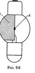 Фотоелементи із зовнішнім фотоефектом являють собою скляні балони, всередині яких розміщено фотокатод і анод (рис. 9.6). Фотокатодом К є шар лужного або лужноземельного металу, нанесеного на основу із срібла. Анод А має форму стержня, кульки або петлі. В газонаповнених фотоелементах із зовнішнім фотоефектом є якась кількість інертного газу, внаслідок чого струм у фотоелементі створюється не тільки електронами, що вивільняються із фотокатода під дією світла, а й електронами та іонами, що виникають внаслідок іонізації газу. Наявність газу дає змогу збільшити чутливість фотоелементів у 5 -н 10 разів порівняно з вакуумними.