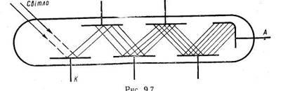Для підсилення фотоструму часто користуються фото помножувачами (рис. 9.7), дія яких ґрунтується на явищі вторинної електронної емісії. Кількісно вона характеризується коефіцієнтом вторинної емісії а = пг1пг (відношення кількості вибитих електронів п2 до кількості падаючих %).