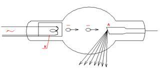 Электрический ток в вакууме применяют для получения рентгеновских лучей. Рентгеновские лучи испускаются любым веществом, которое бомбардируется быстрыми электронами. Для получения интенсивного пучка этих лучей Рентген (в 1895 г. открыл эти лучи) построил специальную трубку, состоящую из хорошо откачанного стеклянного шара, в который впаяны три металлических электрода: катод в виде сферической чашечки, анод и антикатод. Электроны, вылетающие нормально к поверхности катода, попадают в его центр кривизны, лежащий на антикатоде, изготовленном из тугоплавкого металла. Антикатод установлен под углом 45° к катоду для наиболее удобного использования выходящих из него рентгеновских лучей. Накапливание на антикатоде отрицательного электрического заряда могло бы привести к прекращению работы трубки, поэтому он соединен с анодом.