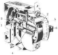 1 – нагревательный элемент; 2 – кнопка возврата; 3 – контакты теплового реле; 4 – биметаллическая пластина; 5 – шкала регулировочного рычага; 6 – рычаг-регулятор