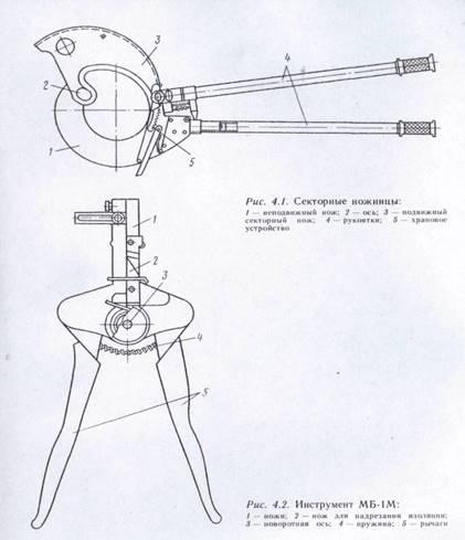 В электромонтажном производстве и при ремонте электрооборудования широко применяют ручные механизмы и инструменты специального назначения, изготовляемые в виде индивидуальных наборов или наборов для бригады. Наборы комплектуются оптимальным подбором инструмента для выполнения определенных видов работ и размещаются в специальных футлярах или сумках, удобных для транспортирования и переноски. Наборы выпускаются для выполнения следующих работ: общего характера (набор инструмента электромонтажника) — НЭ; для кабельных — НКИ-3; на линии — ИН-8МА; для монтажа вторичных цепей коммутации — НК; для паяльных — НСП-1 и др. Разнообразные инструменты выпускаются для работы с проводами и кабелями: секторные ножницы НС (рис. 4.1) для перерезания проводов и кабелей; инструмент МБ-1М (рис. 4. 2) для снятия резиновой, пластмассовой и хлопчатобумажной изоляции и перерезания жил кабелей сечением до 6 мм'2; кабельный нож НКП-2 для продольной и поперечной резки пластмассовых, резиновых и свинцовых оболочек кабелей; прессы гидравлические ПГЭ-20 и ПГР-20М; ручные механические РМП-7М (рис. 4.3) и пресс-клещи ПК1 для соединения и оконцевания жил проводов и кабелей способом прессования; пресс-ножницы ручные для перерезания сталеалюминиевых проводов сечением до 500 мм2; универсальные клещи КУ-1 для перекусывания, вырезания пленки, снятия изоляции, закручивания колец и зачистки жил па проводах любых марок и др.